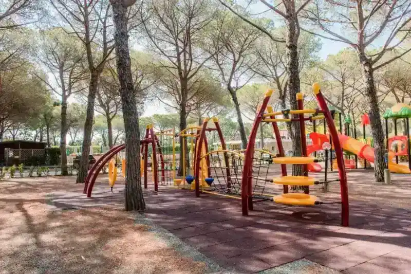 The play area, completely fenced and shaded, extends for about 3,500 sqm near the bar and the pool. It is an ideal space for family leisure time, featuring ping-pong, a bocce court, and play structures, as well as a stage for entertainment and shows.