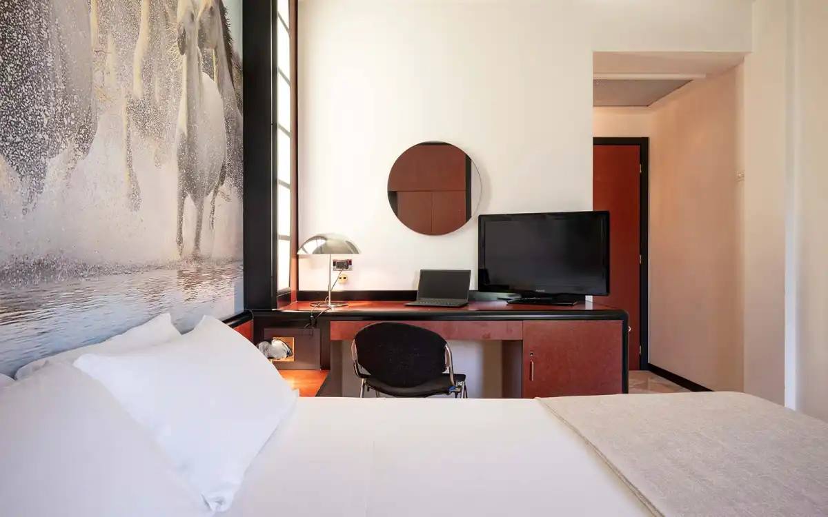 La struttura dispone di 72 camere tra singole, matrimoniali e suite, arredate con uno stile che unisce tradizione classica e comfort moderni. Gli ambienti, luminosi e accoglienti, sono dotati di aria condizionata, Wi-Fi gratuito, minibar, cassaforte e scrivania, offrendo uno spazio ideale sia per il riposo sia per il lavoro.